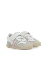 Zapatillas deportivas para bebé de la marca Mustang, modelo Free Baby,estilo casual. Su diseño combina paneles lisos en blanco y rosa con zonas de textura tipo serraje en gris y cierre de tira adherente junto a cordones elásticos para mayor ajuste. Con certificado VEGANO sellado por INESCOP....