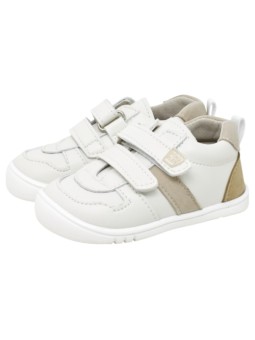 Diseñada para acompañar el desarrollo natural del pie, ofrece libertad, comodidad y seguridad en el día a día. Su combinación en blanco con detalles beige la convierte en un básico imprescindible para cualquier temporada.